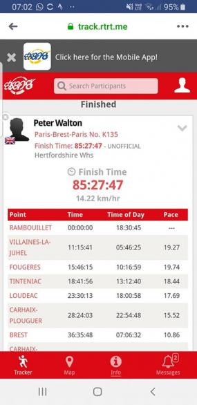 Herts Wheeler Peter Walton completed the event this year for the second time. He finished in 85h 27m 47s, an overall average speed (including food and rest stops) of 14.22 km/h. This was comfortably within the 90 hour limit.