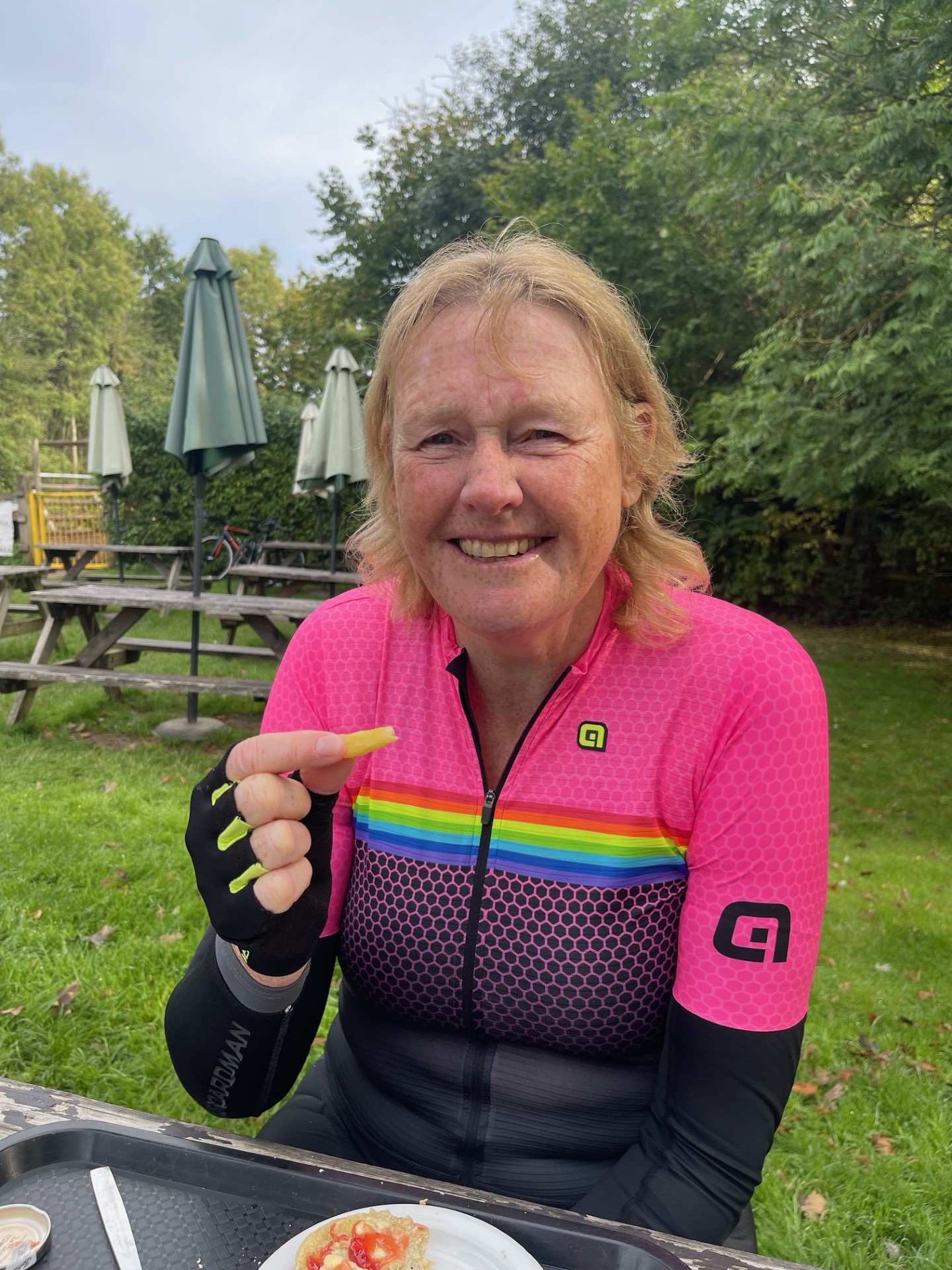 Carolyn enjoying the food of the Devil...